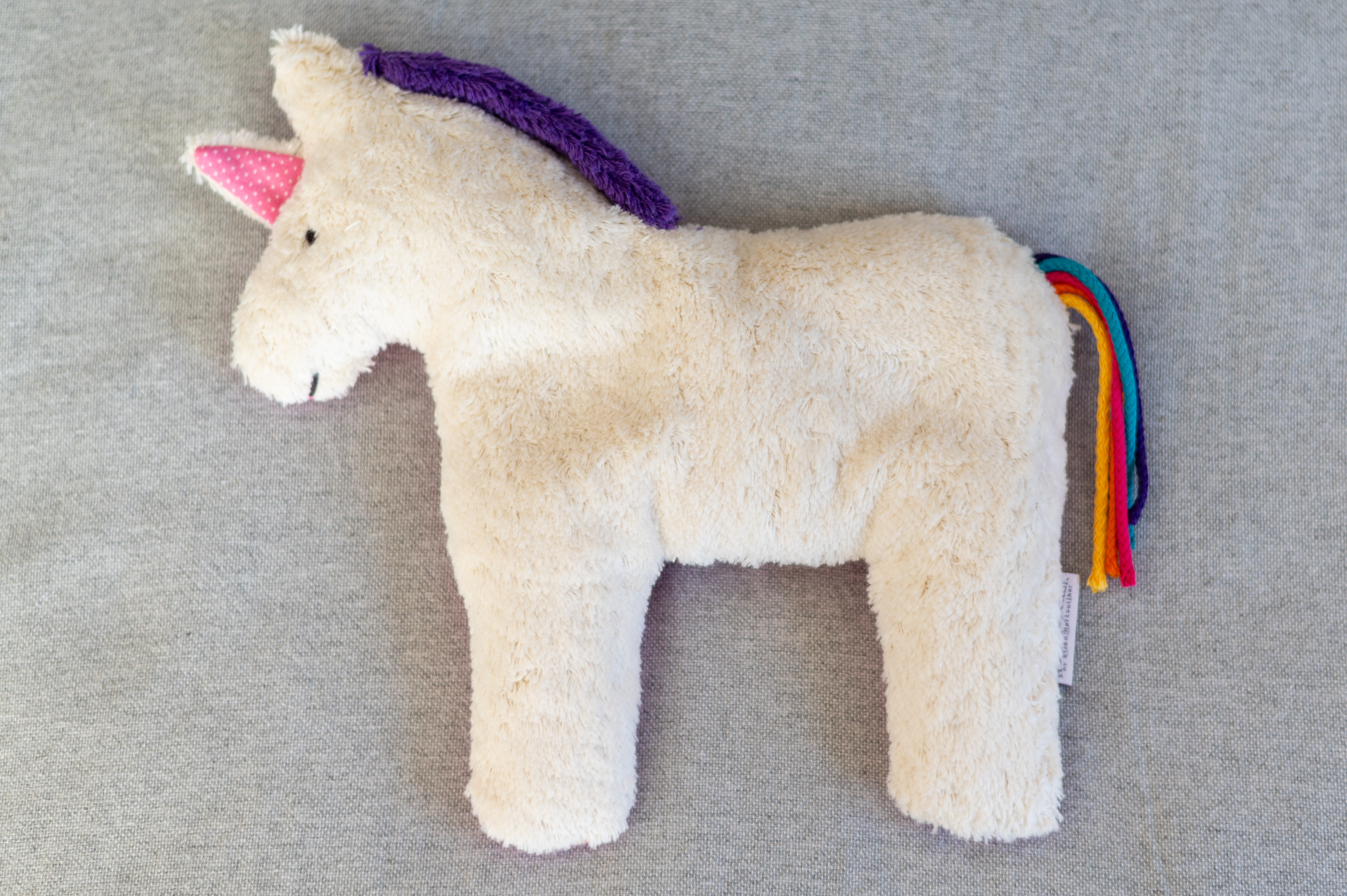 Elin das Einhorn macht süße Mädchenträume wahr und ist aus weichem Baumwollplüsch mit rosa Pünktchenstoff als Rückseite. Elin verzaubert Dich mit ihrem hübschen Schweif in Regenbogenfarben. "Mit deinem Einhorn erlebst Du zauberhafte Kuschelstunden...!"